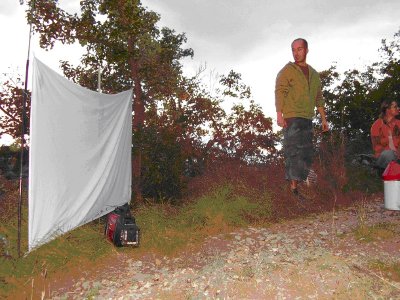 Po velmi pěkné přednášce jsem chvíli tajemně čekali na prvního motýla, který se lapil do vertikálně zavěšené bílé plachty, jenž byla osvětlována silnou žárovou a napájena benzínovým agregátem. První „šťastlivec“ patřil ke druhu můra stepní. Poté se můry tzv. rozjeli a rozlétali a začali se lapat samy. Z dalších druhů jsme spatřili zejkovce jasanového, přímočarku, píďaličku, šedobarvce dřišťálového a další.